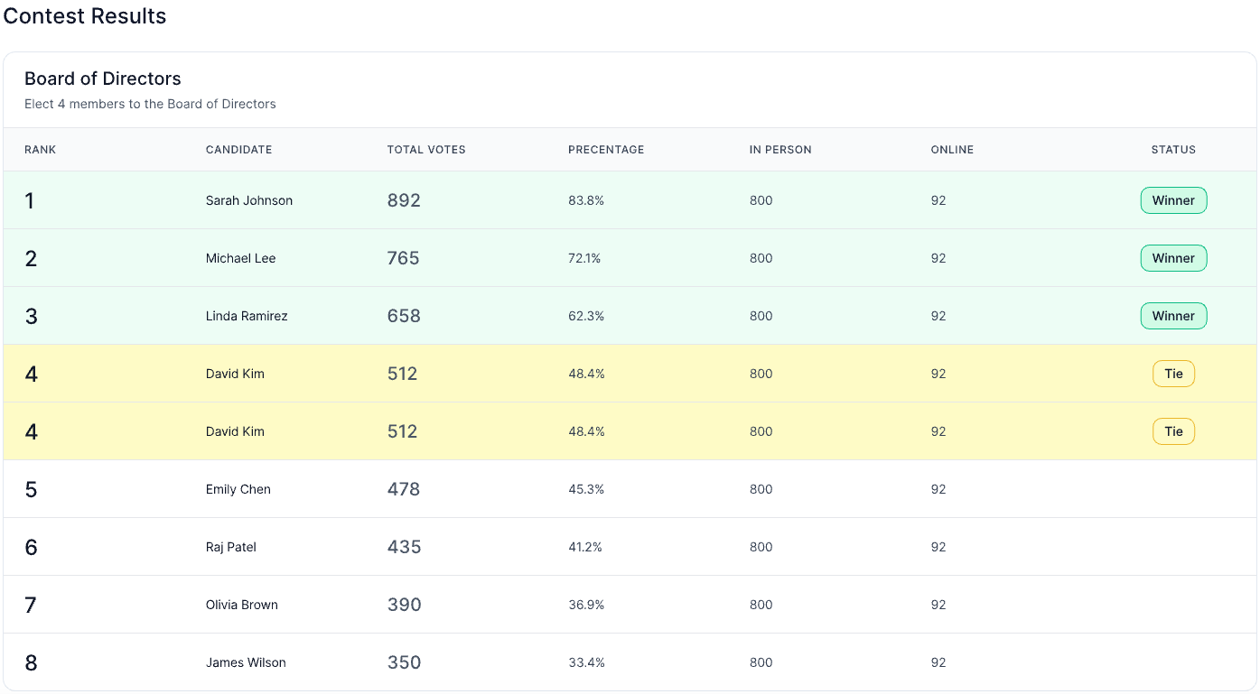 Each contest has its own results table showing every candidate or option, ranked by total votes received. The table includes the candidate's name, total vote count, percentage of valid votes, in-person votes, online votes, and final status. Winners are highlighted in green so they are immediately identifiable at a glance. If two or more candidates are tied, the relevant rows are highlighted in yellow and marked Tie this is a signal that your organization may need to apply a tiebreaking procedure in accordance with your governing rules.