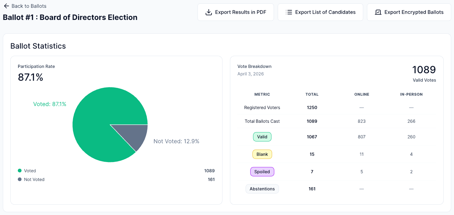 Once voting closes and all trustees complete their decryption, each ballot has a dedicated results page. Click on any ballot from the Ballots page to access it. The results page is organized into several sections, each providing a different view of the outcome.