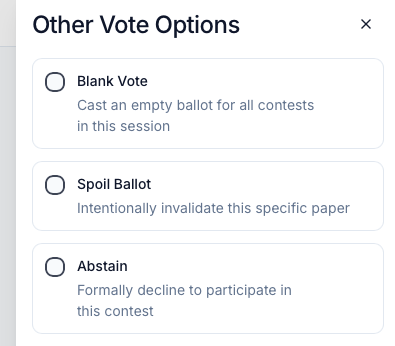 | Blank Vote | Cast an empty ballot for all contests in this session, registering your participation without selecting any candidate |