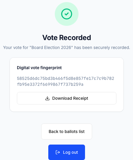 On this screen you will also see your Digital vote fingerprint — a unique cryptographic hash that identifies your encrypted ballot. This fingerprint is your personal proof of participation. Click Download Receipt to save a copy of it. You can use this receipt later to independently verify that your ballot is included in the final tally, as part of Electobox's end to end verifiability features.