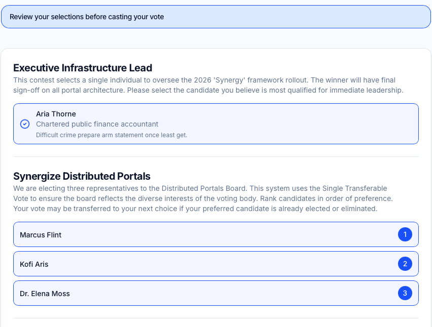 Once you click Cast Final Vote, your vote is permanent. It cannot be changed, withdrawn, or retracted under any circumstances. Your voting link is deactivated the instant your ballot is submitted, ensuring that each person votes exactly once. This is a core part of how the system protects the integrity of the election.