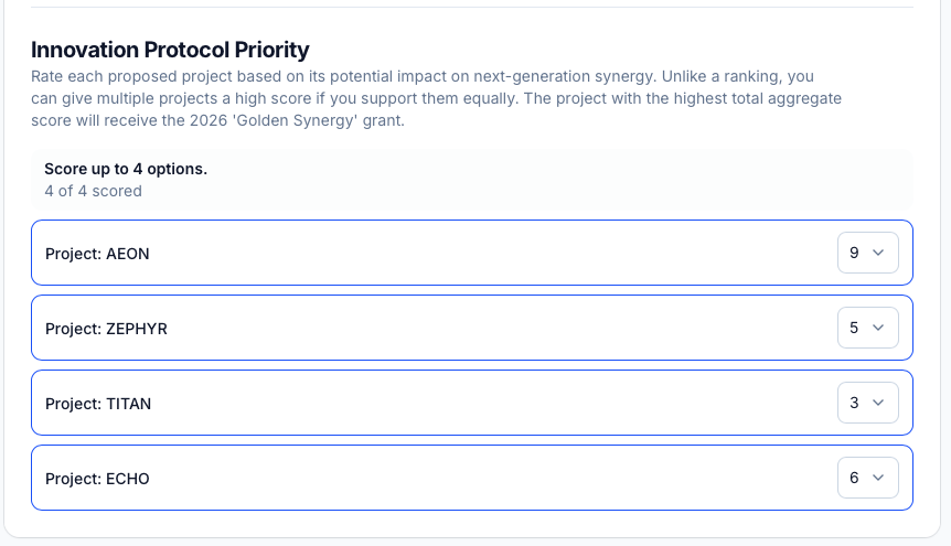 The contest shows how many options you are asked to score, for example "Score up to 4 options." If you have no opinion on a candidate, you can leave them unscored. Only candidates you actively score will be included in the tally for your ballot.