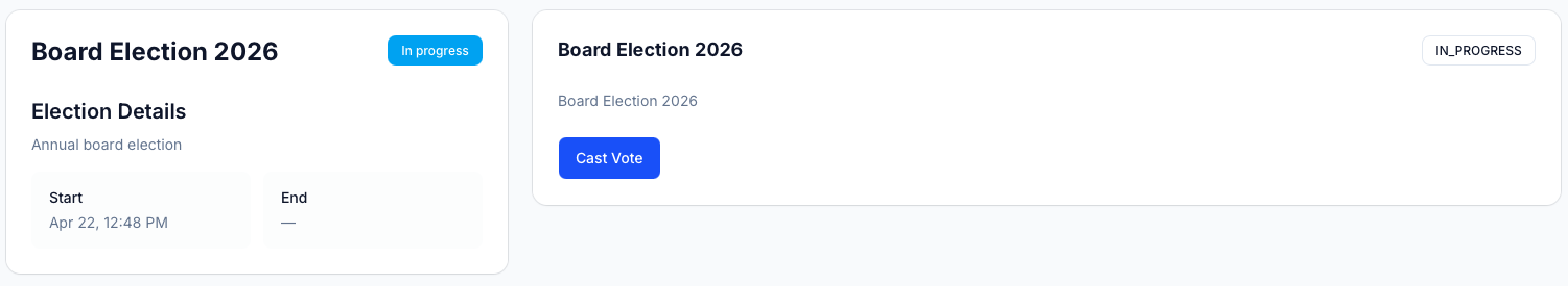 After any required verification, you will land on the election page. This page shows the election name, a description of what the election covers, the start time, and the current status. It is worth reading the description here if you are not already familiar with what you are voting on, as the contest pages may not always include full background context.